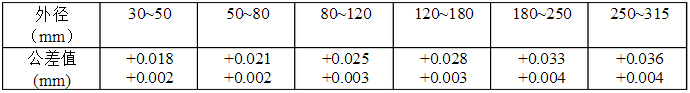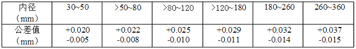 軸承與軸承室配合,其軸承套內(nèi)徑選擇公差見(jiàn)表二。在加工中應(yīng)盡量控制在中間公差的上偏差區(qū)間內(nèi),呈間隙配合,以保證電機(jī)在額定運(yùn)行中其軸貫通部分發(fā)熱時(shí),為熱膨脹留有一定裕度。但是軸承套加工尺寸不宜過(guò)大,否則會(huì)發(fā)生跑套現(xiàn)象,軸承更容易發(fā)熱,為此在檢修中,應(yīng)嚴(yán)格把住軸承內(nèi)、外徑實(shí)際配合精度,以保證軸承裝配后達(dá)到有限自由的穩(wěn)定運(yùn)行狀態(tài)。