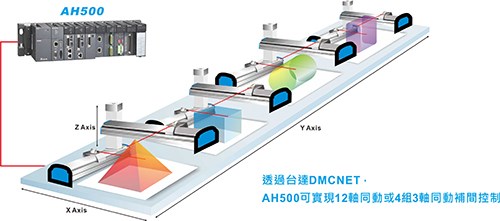 AH500的優(yōu)異運動控制功能,可實現(xiàn)任意三軸直線補間、任意兩軸圓弧補間、及任意三軸螺旋補間與連續(xù)補間功能,透過臺達DMCNET高速通訊網(wǎng)絡(luò)架構(gòu),可達到1ms的指令周期內(nèi)12軸同動或4組3軸同動補間功能。無論是復(fù)雜的過程控制或是精密的運動控制需求,都能透過AH500來實現(xiàn),有效應(yīng)用于各種產(chǎn)業(yè)機臺,如建材機,經(jīng)編機,食品包裝機等等。