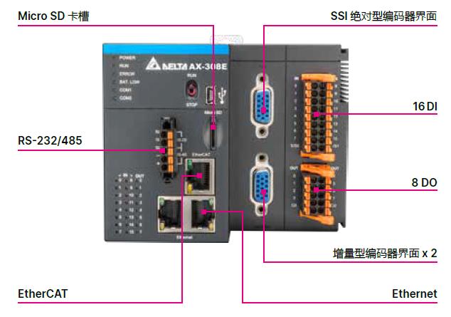 ● AX-3運(yùn)動(dòng)控制器內(nèi)置多種I/O與通訊接口,滿足精巧、高效能與高價(jià)值的市場(chǎng)需求